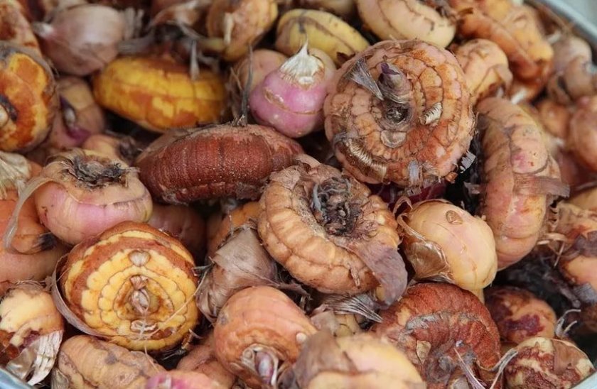 После выкапывания на луковицах следует оставить часть стебля длиной 2-3 см. Клубеньки освобождают от земли, подрезают корни, тщательно осматривают. На хранение закладывают только здоровые экземпляры. Материал разделяют по сортам, промывают, обрабатывают Фундазолом и высушивают в течение месяца в проветриваемом теплом помещении.