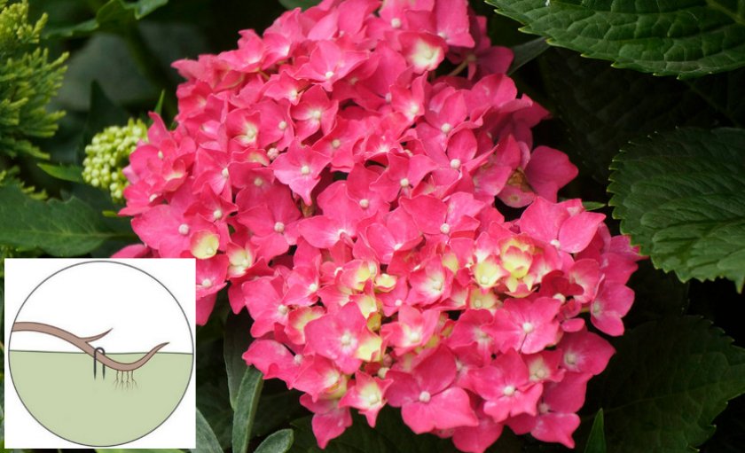 Отводками гидрангею размножают ранней весной до распускания почек. Вокруг материнского растения рыхлят почву. С боковых побегов оборвать листву. В почве сделать углубления 2 см и туда пригнуть и зафиксировать побеги, предназначенные для укоренения. Полив отводок осуществляют каждый день. Почва должна быть влажной. В конце летнего периода отводки пустят корни и образуют новые побеги.