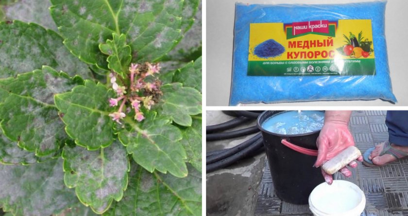 Ложная мучнистая роса, при которой на листьях и стеблях образуются тёмные маслянистые, постепенно расползающиеся пятна, поражает гортензию при температуре 18-20 градусов в сочетании с высокой атмосферной влажностью. Эффективным средством от такого заболевания является опрыскивание медно-мыльным раствором: 15 г сульфата меди и 150 г зелёного мыла на ведро воды.