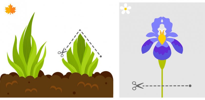 В течение сезона необходимо срезать увядшие бутоны, а когда цветение завершится, полностью удаляют цветоносы. В самом конце сезона ирисы подстригают, обрезая листья до 10 см. Примерно раз в четыре года ирисы следует разделять и рассаживать. Для этого сначала срезают листья на уровне семи сантиметров от поверхности почвы, затем выкапывают корни и делят их на части. Важно, чтобы на каждом фрагменте оставалось как минимум по одной-две листовых розетки.