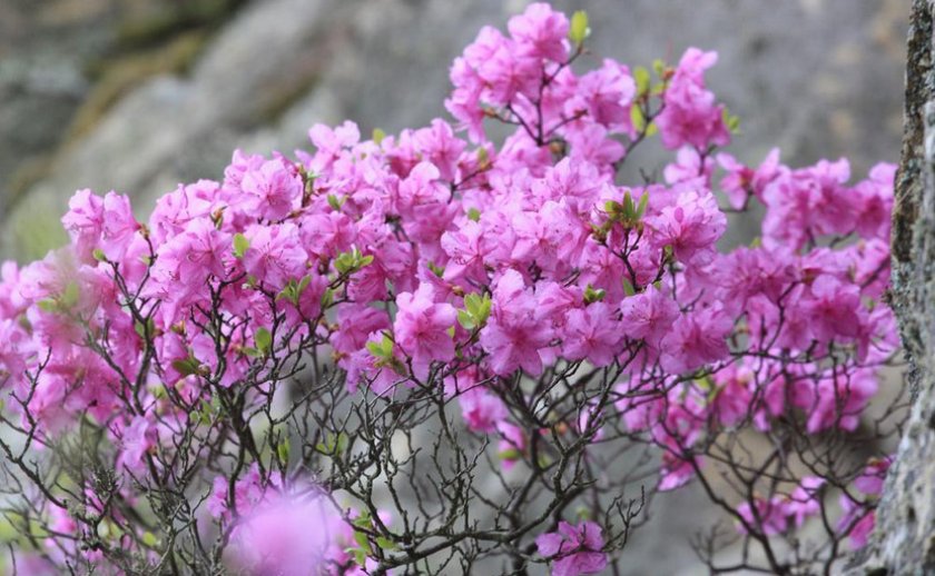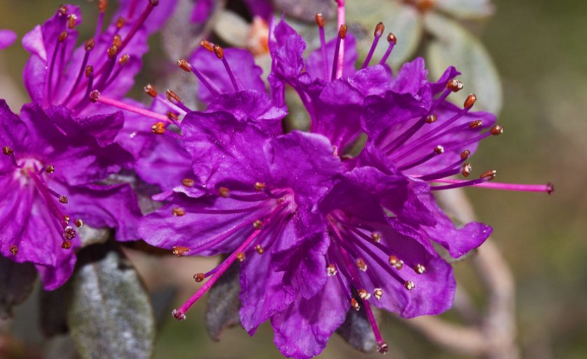 - Сихотинский. Этот раскидистый кустарник вырастает до 3 м. Кожистые листья при похолодании осенью приобретают фиолетовый окрас. Такая разновидность не сбрасывает листву зимой даже частично. Она просто сворачивается. Колокольчатые бутоны в соцветиях имеют фиолетово-розовый цвет.