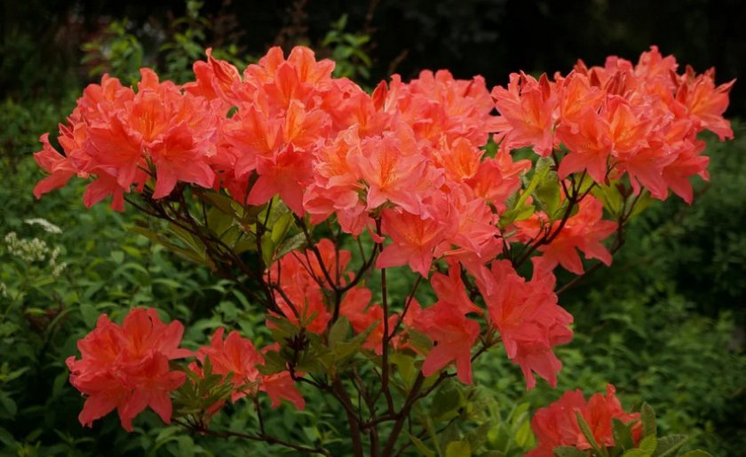 Листопадный рододендрон. Листья ярко-зеленые, осенью – желтые, оранжевые или красные. Оранжевые цветки распускаются до листьев в мае-июне.