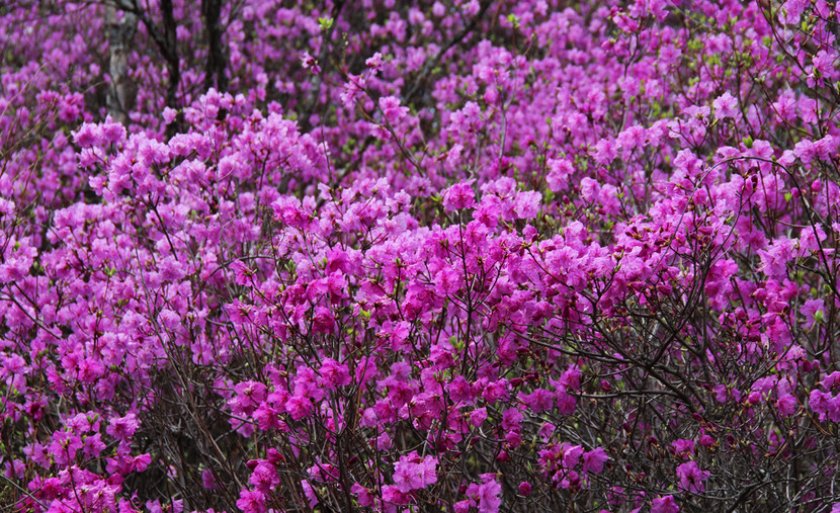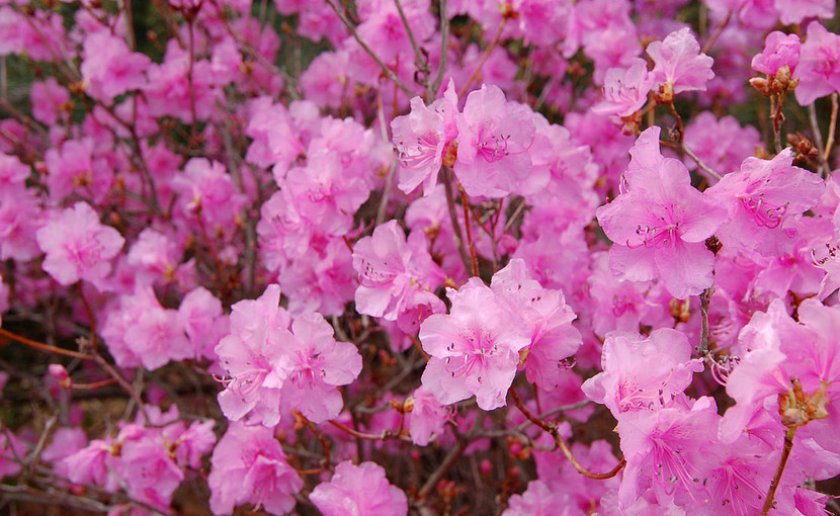 - Даурский («багульник»). Достигает до 2 м в высоту и 1 м в ширину. Цветение начинается со второй половины весны. Обладает зимостойкостью до -30°С. Опасность составляют только возвратные морозы весной. Бутоны (до 4 см в диаметре) окрашены в розовато-красный окрас.