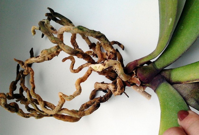 Важно! При наличии мощной, длинной и здоровой корневой системы нежно-зеленого цвета с серебристым отливом категорически запрещается ее убирать и травмировать.