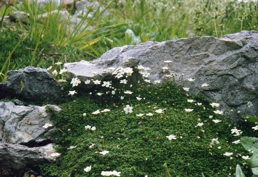Аренария четырехгранная (Arenaria tetraquetra) – ещё один низкорослый вид аренарии. Его высота всего 4 см. Кустики больше похожи на мох, покрытый мелкими нежными беленькими цветочками.