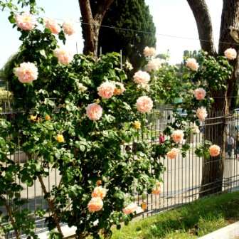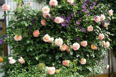 При составлении композиции плетистую розу делают ее центральной частью. Ее нежно-персиковые соцветия эффектно выделяются на фоне газонов, вечнозеленых кустарников и деревьев. Избегают соседства с петунией, бегониями, георгинами и другими яркими цветами. Плетистое растение выигрышно смотрится рядом с культурами, имеющими сероватые или серебристые листья.