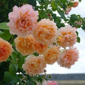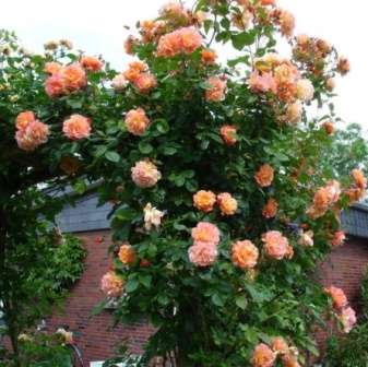Цветки растения одиночные или собраны по 3 — 5 шт. в пышные кисти. Обычно — абрикосовой окраски, они под воздействие солнца теряют насыщенность и остановятся розовато-лососевыми. Аромат плетистой розы выражен слабо.