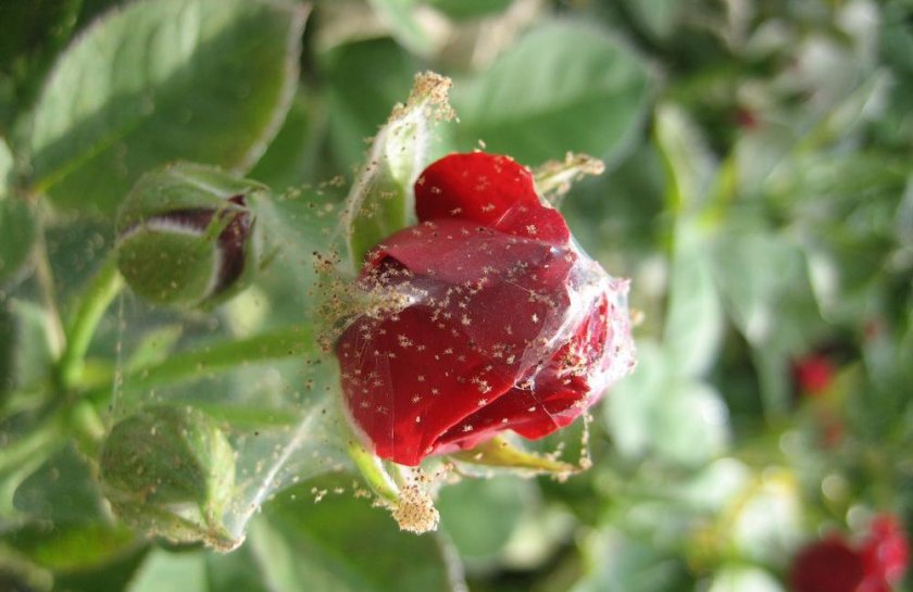 К пожелтению листочков розы приводит паутинный клещ. Насекомое рыжего цвета присутствует на нижней стороне листика. Своей паутиной они окутывают побеги. Вследствие поражения паутинным клещом листы желтеют и сохнут. Причинами заражения может служить иное растение или пересушенный воздух (особенно это относится к комнатным розам). Действенной мерой уничтожения вредителя считается опрыскивание растения “Фитовермом”. Также можно пользоваться “Акарином”, “Вермитеком” и “Актелликом”. Они могут результативно уничтожить яйца паразитов. Проводить опрыскивание необходимо два раза с интервалом в десять дней. Прекрасной профилактикой предупреждения патологии считается регулярное купание растения. Землю нужно накрыть полиэтиленом и поставить горшок под струю теплой воды.