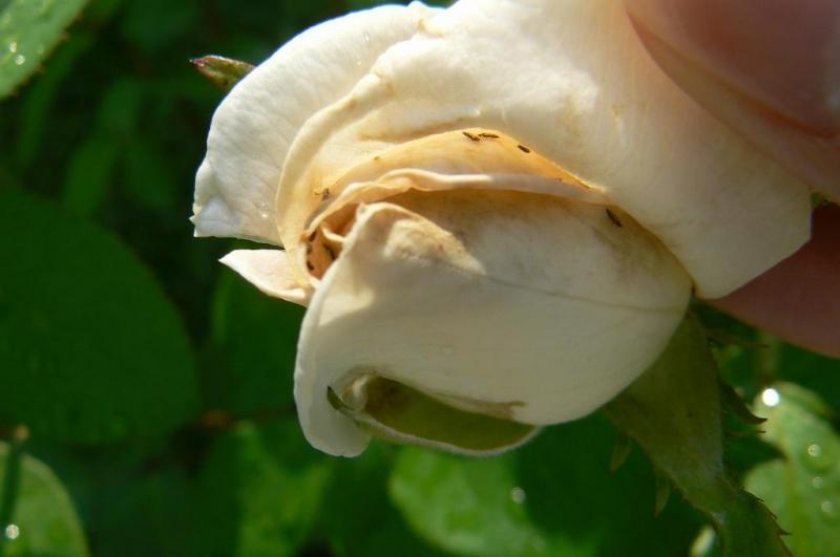 Привести к пожелтению листиков розы могут трипсы. Подвижных насекомых достаточно сложно разглядеть невооруженным взглядом. Они с легкостью могут перелететь на близлежащие цветы. Такое положение дел может вызвать целую эпидемию. Трипсы питаются соком растения. В результате на листочках появляются темные пятнышка, что становится следствием их деформации. Быстрое распространение обуславливается высоким температурным режимом и сухим воздухом.