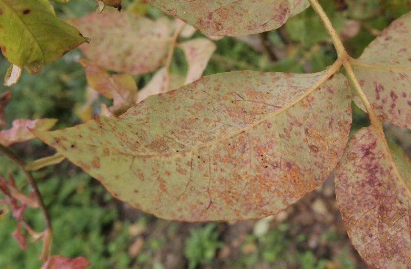 Процесс поражения листьев розы ржавчиной следующий : сначала появляются небольшие оранжевые бугорки, которые со временем разрастаются и заполняют большую часть листовой пластины, в итоге на листьях с обратной (внутренней) стороны вы можете видеть ржавый налет.