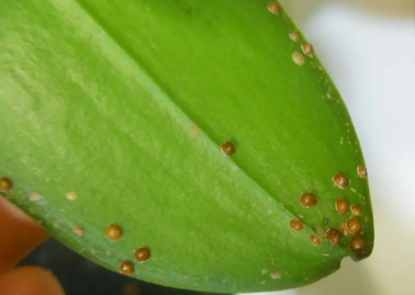 - щитовка. Этих «бродяжек» с восковыми панцирями можно найти на листьях, особенно в нижней части. Вредители вытягивают соки из растения, начинают сохнуть и опадать листья. Для борьбы с щитовками пригодится мягкая щётка, при помощи которой их убирают с листьев. Полезно будет опрыскать их карбофосом или «Рогором».