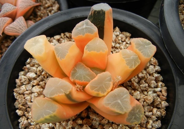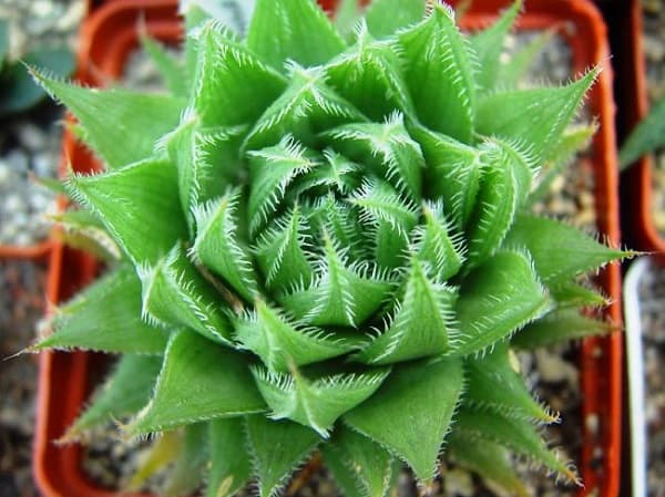 Хавортия Маргината (H. marginata) — имеет явное сходство с искусственным цветком, листья которого созданы из блестящего пластика. С возрастом листва становится более тёмной.