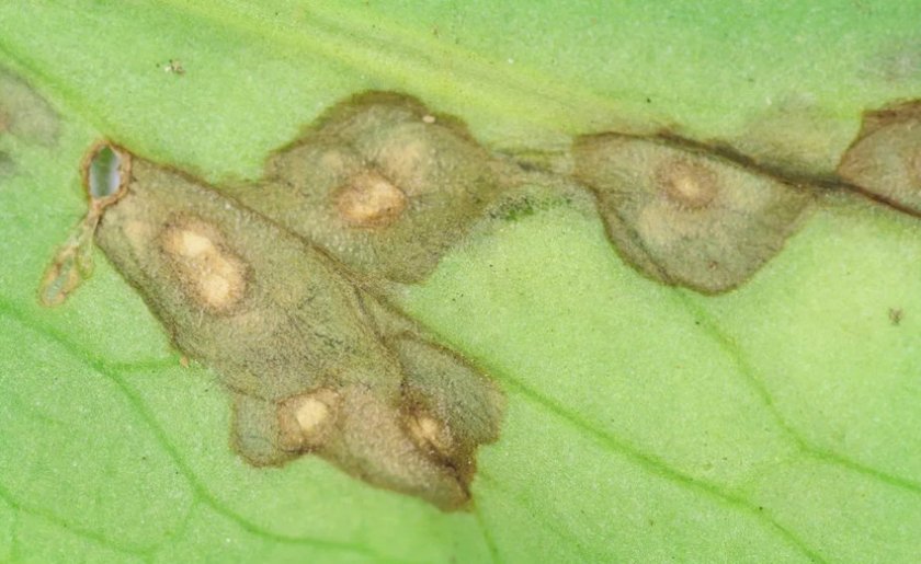 - Рамуляриозная пятнистость — это серо-коричневые пятна, вокруг которых листовая пластина начинает обесцвечиваться до жёлтого цвета. Лечится опрыскиванием «Фитоспорином», «Алирином» или другим препаратом.