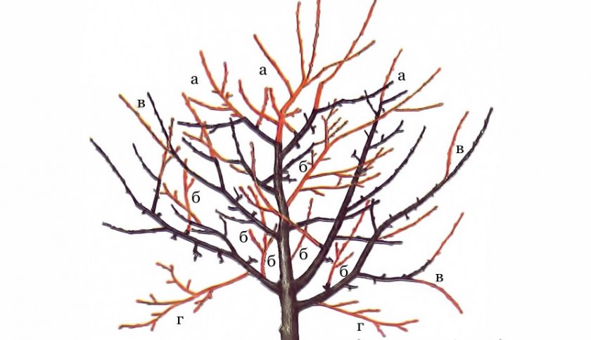 а – понижение высоты; б – прореживание; в – уменьшение ширины; г – обрезка свисающих веток.