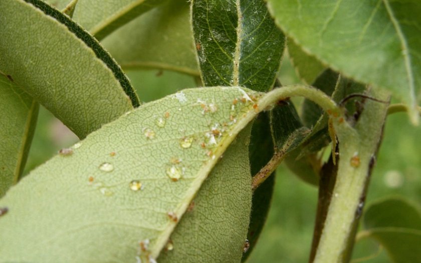 - Медяница грушевая (Psylla pyri). Эти крохотные насекомые имеют длину тела в несколько миллиметров. Они выпускают прозрачную жидкость, покрывающую их места обитания: ветви, листья, цветочные почки груши. Покрытые липкой жидкостью растения замедляются в росте, плоды на них приобретают деформированную форму. На больных молодых грушах останавливается рост почек и цветение. Если с вредителями не бороться в течение нескольких лет, они активно размножаются, и фруктовые деревья перестают расти и плодоносить. Медяницу в фазе развития имаго может уничтожить окуривание дерева дымом: для этого в большой металлической банке или ведре поджигают древесные щепки, поверх огня высыпают табачные отходы и устанавливают самодельное кадило под грушей на 3 часа. После дымного окуривания большая масса медяниц погибает.