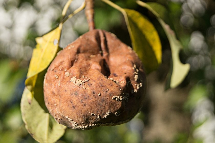 - Груши иногда поражает плодовая гниль. Вызывает её грибок Monilia fructigena. Болезнь проявляется в виде пятен бурого цвета, которые затем загнивают, покрываются белым налётом и опадают. Плоды также могут мумифицироваться на ветках. Для борьбы с болезнью используют бордоскую жидкость.