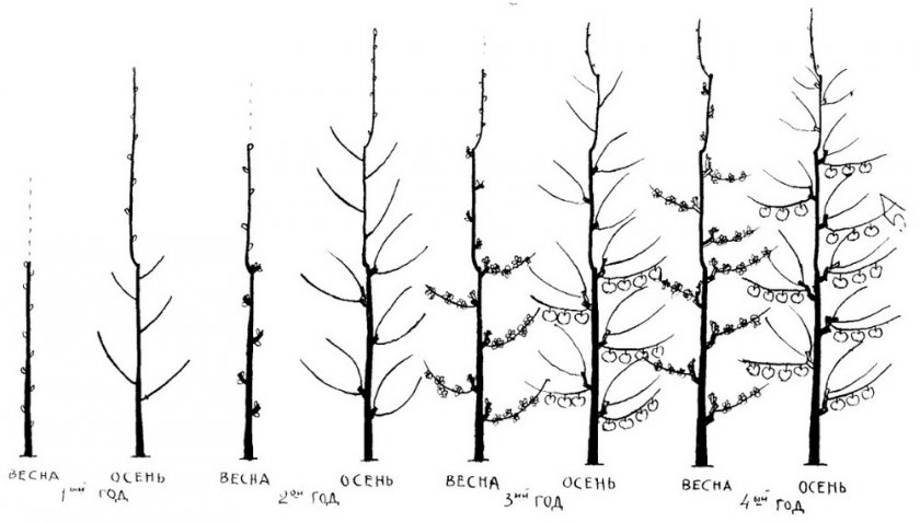 Их классифицируют как полукарликовые яблони и формируют крону в один ствол.