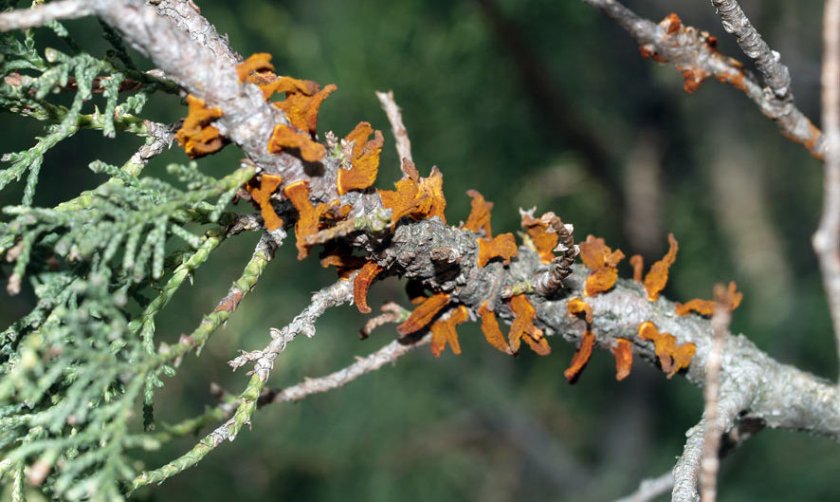 - Ржавчина. Поражение характеризуется образованием вздутий на ветвях — наростов ярко-оранжевого цвета. Болезнь может прогрессировать несколько лет, сопровождаясь осыпанием хвои. Чтобы избавиться от недуга, следует обрезать все видимые повреждённые участки и обработать кустарник препаратами «Скор» или «Вектра».