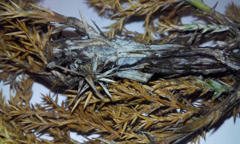 - Трахеомикоз — широко распространённое заболевание среди хвойных растений. Инфекция чаще всего прогрессирует при застое воды и переуплотнении почвы. Заражение происходит через корневую систему, которая и страдает в первую очередь, обрастая светлыми сероватыми спорами. Постепенно грибок переходит на ствол и ветви растения. Отмирание побегов начинается с верхушки и сопровождается покраснением хвои. Поражённые участки нужно обрезать, сам кустарник и обязательно почву под ним обработать фунгицидами «Фитоспорин» или «Максим».