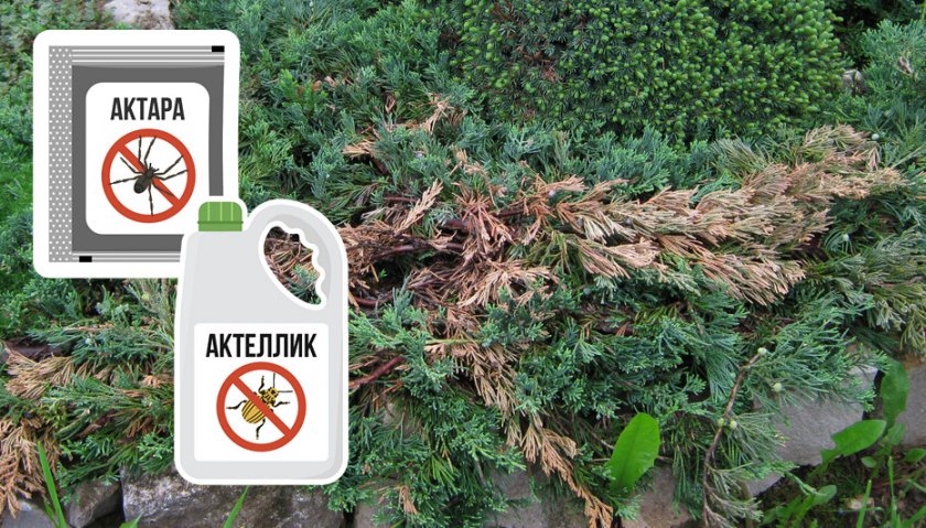 К наиболее опасным вредителям можжевельника относятся: тля, европейская щитовка, можжевельниковая моль и мраморный хрущ. Признаками заселения кустарника одним из этих видов насекомых чаще всего являются скручивание и усыхание хвои. Борются с ними с помощью ядохимикатов, которыми обрабатывают крону, побеги и приствольный круг 2-3 раза с интервалом 2 недели. Для этих целей подойдут средства «Актара», «Бомбардир» и пр.