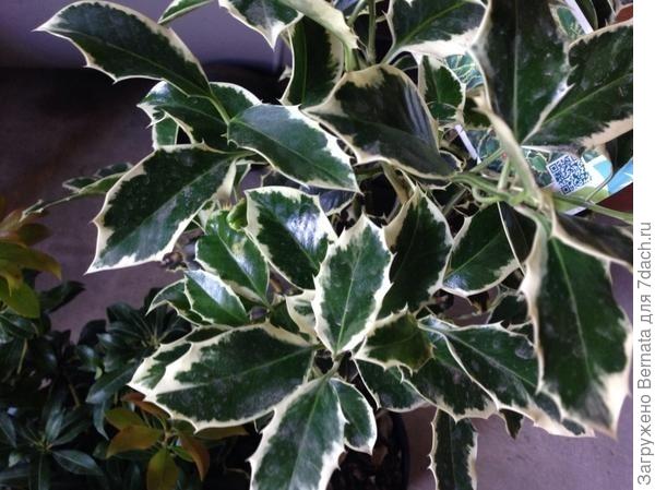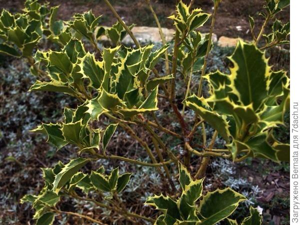 Всё бы замечательно, но клумба находится на солнце от восхода до заката, а центральной фигурой я сделала пестролистный вечнозеленый падуб, не учитывая, что на ярком южном солнце листва его побледнеет… Падуб я пересадила в полутень, но место освободилось, а память больше никого не подсказывала, чтобы и вечнозеленый, и окраска пестренькая с белыми штрихами.