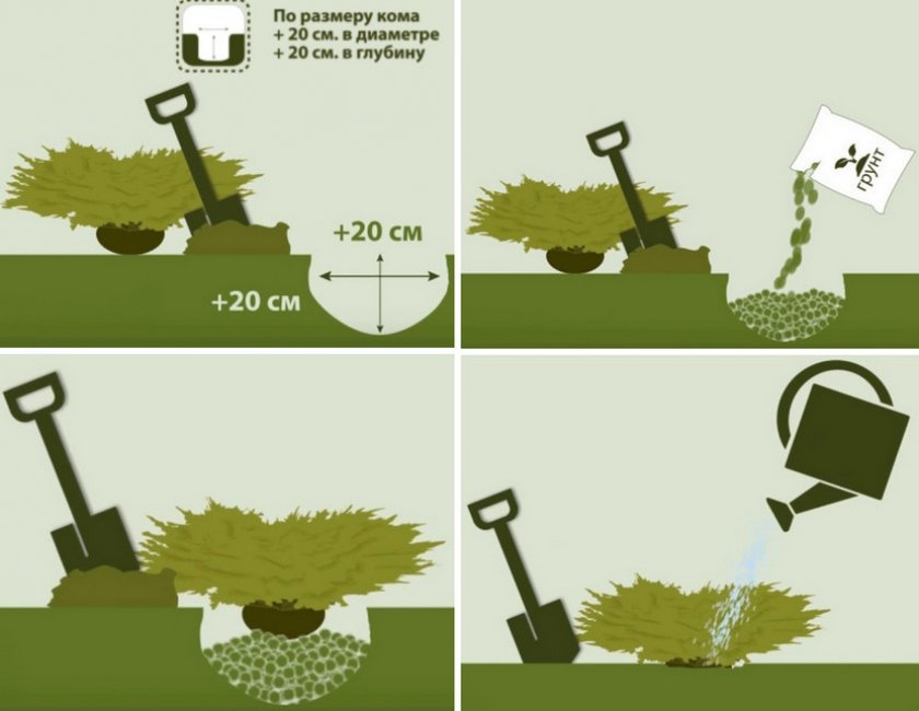 Для посадки необходимо выкопать яму или траншею с минимальной глубиной 60 см. Размеры ямы должны быть выбраны на основании цели выращивания растения. Для одиночной посадки подойдет обычная посадочная яма, вмещающая всю корневую систему саженца с земляным комом. При формировании бордюров или ковровых покрытий рациональнее подготовить траншеи. Между соседствующими растениями должно быть оставлено расстояние 50-100 см. На дне для защиты от влияния грунтовых вод нужно соорудить дренажный слой, не менее 20 см толщиной, из колотого кирпича.