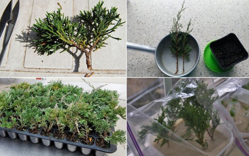 Для заготовки черенка лучше выбрать взрослое растение 8-10 лет. Проводить срезание черенков лучше в прохладную и пасмурную погоду. В таких условиях родительское растение быстрее восстановится. Каждый черенок должен составлять 10-12 см в длину. С нижней части необходимо удалить всю хвою и поместить будущий саженец в раствор корнеобразователя.