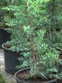 - Можжевельник обыкновенный ‘Hibernica’ — сильнорослая колонновидная форма. Высота в возрасте 10 лет — 2 м. Хвоя короткая, голубовато-стального цвета. Требования к почве и влажности невысокие, морозостоек, на зиму крону необходимо связывать, чтобы предотвратить обламывание ветвей под тяжестью снега. Рекомендуется для небольших садов.