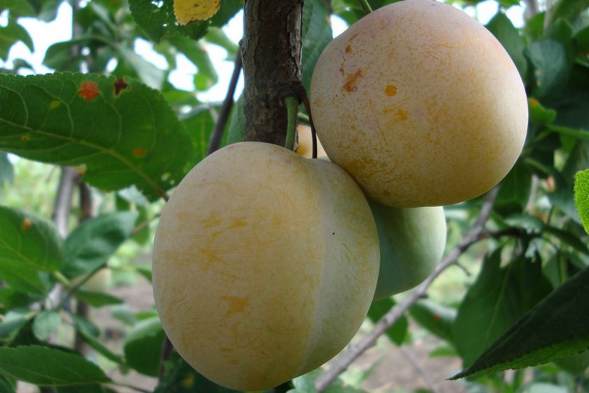 Сливы созревают со второй декады августа. Они имеют вес в среднем по 40 г, круглые, с зелено-желтой кожурой. Мякоть насыщенного желтого цвета, очень сочная, поэтому для продажи плоды собирают заранее, чтобы в дороге не давились. Вкус десертный, нежный, кислоты практически не слышно.