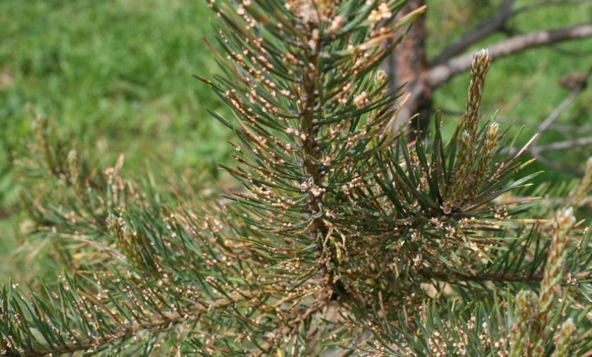 Меры борьбы. Пораженные побеги надо многократно обработать раствором жидкого мыла или удалить. Сухую хвою можно счесать маленькими веерными граблями, постелив под деревом полиэтилен или другой материал, и собранную хвою сжечь. При большом распространении вредителя применять пестициды системного действия, которые проникают в растительную ткань и переносятся по сосудам по всему растению.