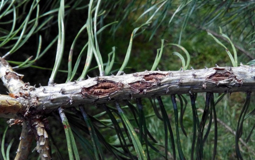 - Побеговый рак — при нём хвоя краснеет, наклоняется в низ, а со временем опадает. Приводит к отмиранию побегов на верхушке. На коре дерева появляются чёрного цвета образования в виде бородавок. Попробовать вылечить это заболевание можно обработав поражённые участки фунгицидами.