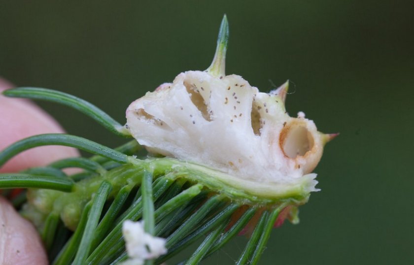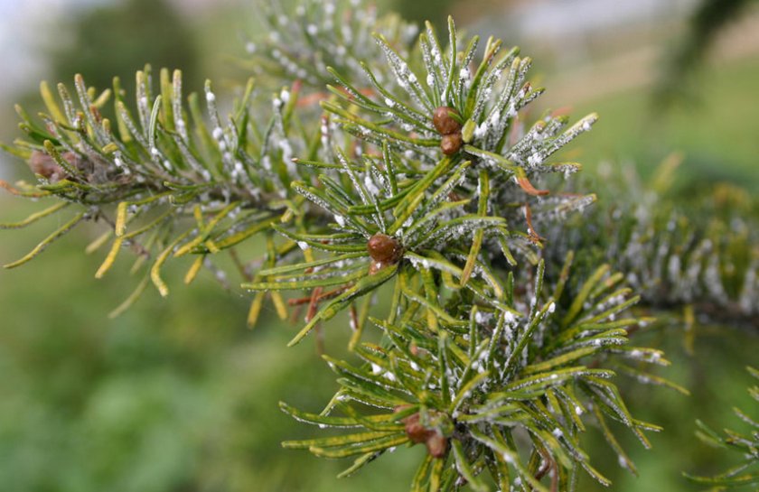 Пихта, кедровая и обыкновенная сосна, ель, лиственница иногда заражаются быстро размножающимся хермесом, его еще называют сосновой тлей. Определение вредителя упрощается появлением белого налета.