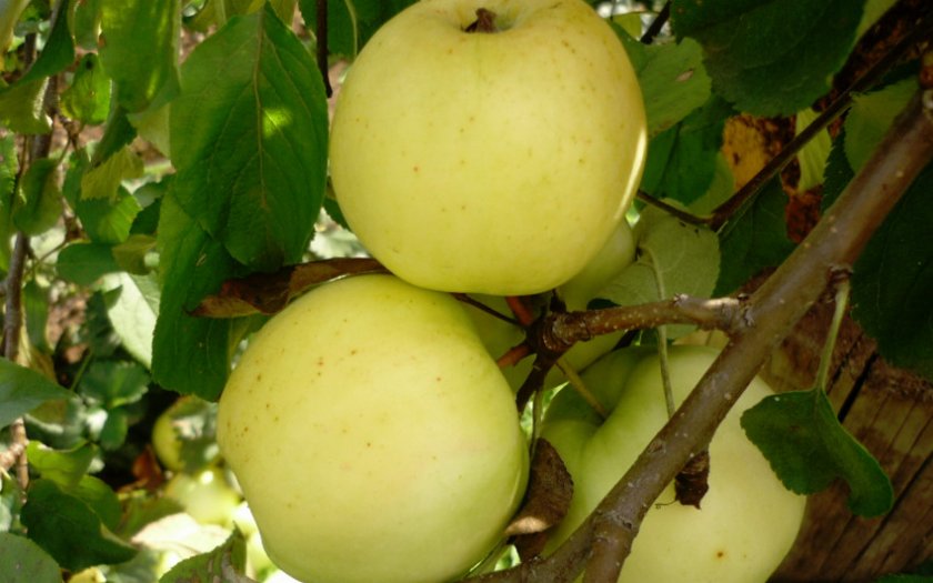 При правильной подкормке и очень хороших условиях содержания можно добиться урожая в 150-180 кг. Цвет плодов варьируется от зеленовато-жёлтого до почти белого с жёлтым оттенком. Мякоть нежная и очень сочная с заметной кислинкой. Яблоки не слишком крупные и редко превышают вес 120 грамм.