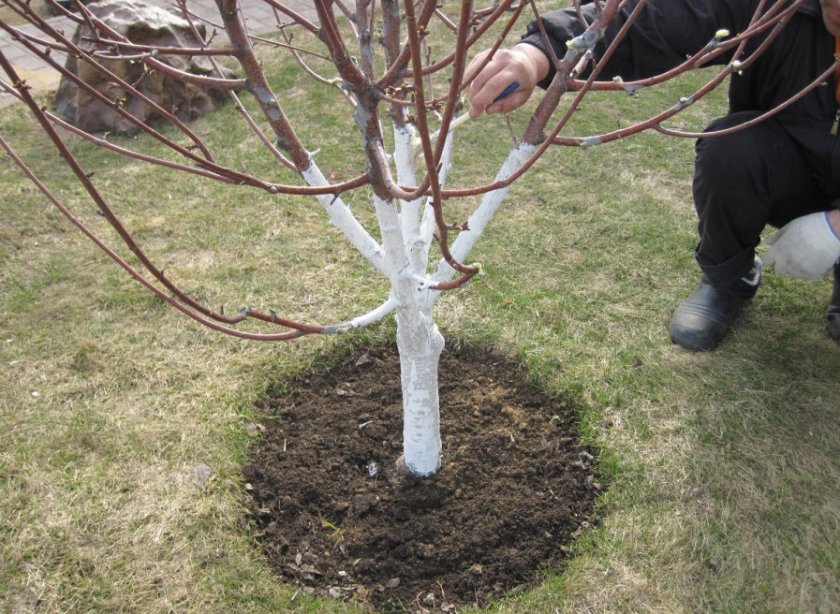 Не помешает с осени побелить стволы и нижние скелетные ветки известкой, чтобы выгнать насекомых, собирающихся зимовать в прикорневой зоне. Чтобы голодные грызуны не объедали кору и молодые побеги дерева, стволы смазывают солидолом и топленым салом.
