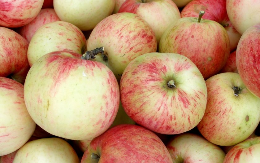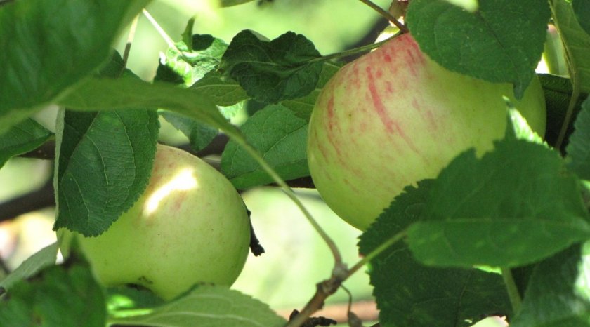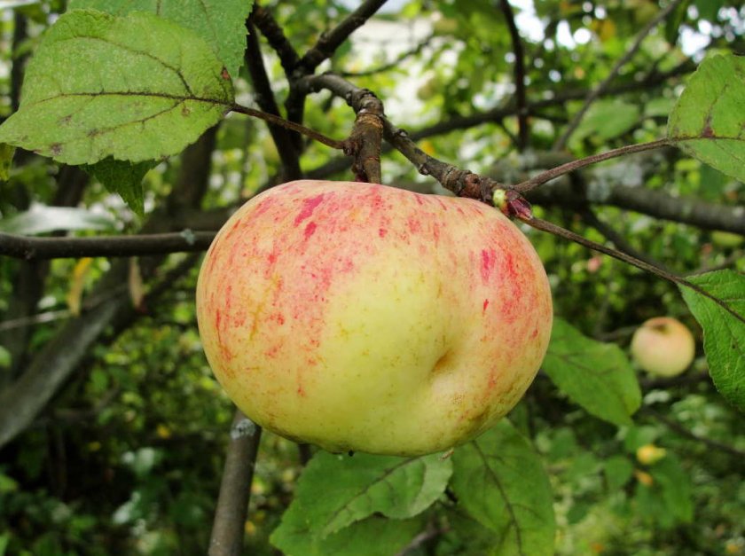 - Само яблоко желто-зеленого цвета с пурпурно-красными полосками.