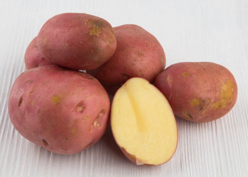 Клубни большого размера, средний вес одного — 90–130 г, иногда достигают 150 г. Форма продолговатая с округлыми краями. Кожица плотная, на поверхности есть небольшие глазки красноватого оттенка. Цвет кожуры темно-розовый, мякоть желтоватая с незначительным янтарным оттенком. Содержание крахмала в каждом клубне — 13–15%. При варке картофель сохраняет свою структуру.
