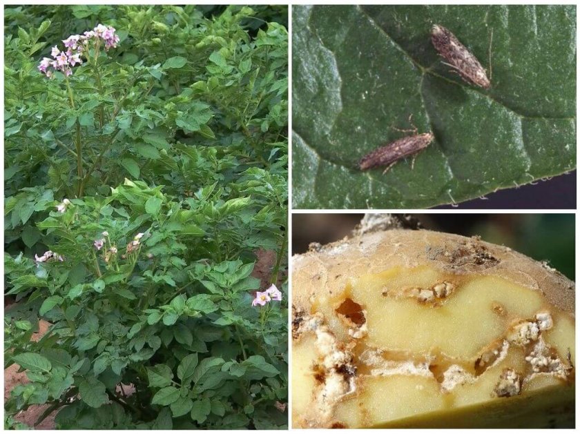 - Картофельная моль. Наиболее опасна для корнеплодов. Эти насекомые стремительно размножаются и могут быстро уничтожить значительную часть урожая, поэтому при их появлении нужно сразу же принять меры по борьбе с ними. О появлении этой моли сигнализирует загнивание листочков и наличие тоненькой паутины. Чтобы не сомневаться в появлении этого вредителя, куст с указанными признаками следует осторожно копнуть и вытянуть корнеплод, который будет повреждён насекомыми. Для борьбы с такими вредителями применяют химпрепараты «Лептоцид», «Дендробациллин».