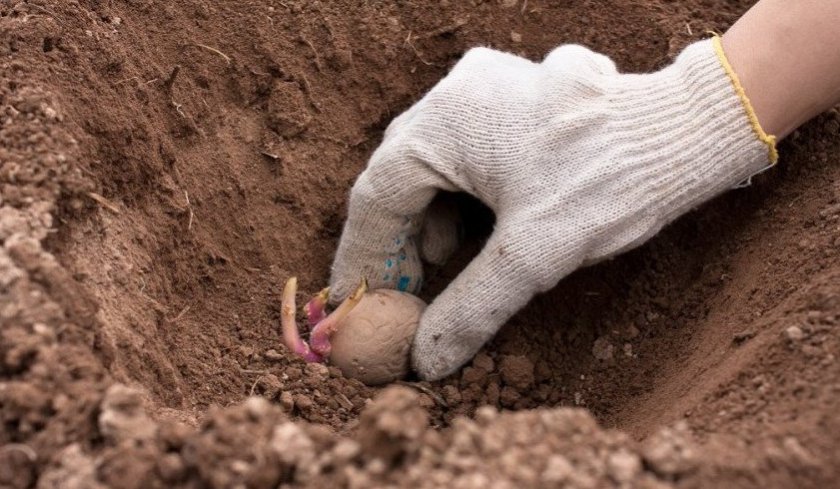 - в углубление располагают клубень проросшей стороной вверх на глубину 10–12 см;