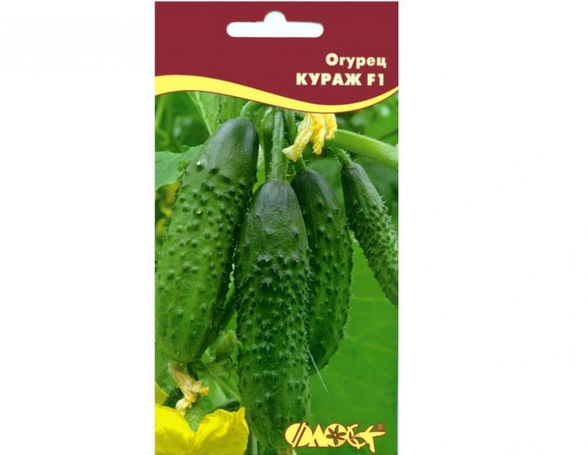 - Кураж F1. Первые плоды снимают примерно через 50 дней после появления ростков. Растения раскидистые, образуют завязи целыми пучками, одновременно на плети может созревать до 20 зеленцов. Не требуют опыления, плодоносят как минимум 2 месяца. Используются свежими и для любых видов заготовок. В пакетики фасуется по 10 семян, упаковка стоит около 70 рублей.