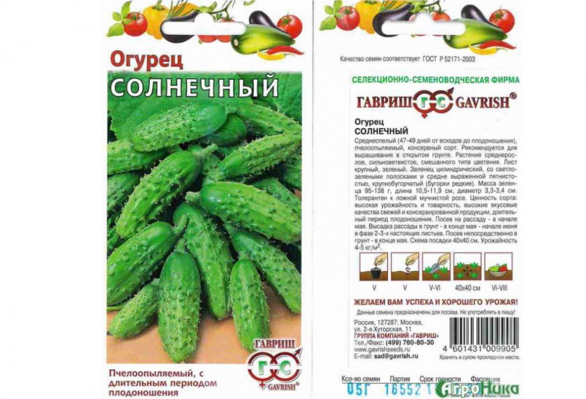 - Солнечный. Растения со смешанным типом цветения, пчелоопыляемые. Начинают плодоносить через 50 суток после прорастания, но основной урожай дают позже, собирать огурцы можно до заморозков. Плоды длиной до 12 см, подходят для свежего потребления, особенно хороши в заготовках. Фасуется в пакетики по 0,5 г, стоит от 12 до 15 рублей за упаковку.