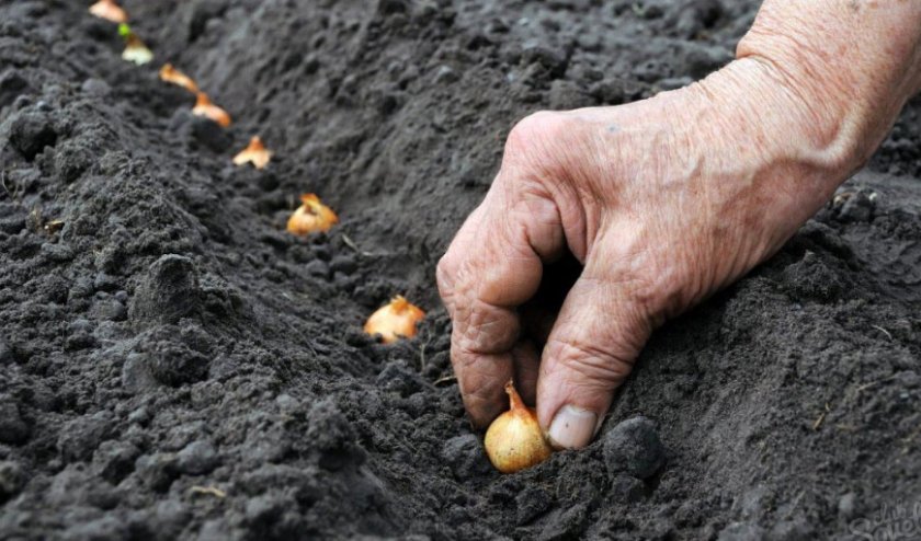 Оптимальная глубина посадки – 5-8 см. Если поместить половинку на меньшую глубину, есть большая вероятность, что ее корневая система пересохнет. Засыпая, лук можно окучивать таким же образом, как и картофель. Важно, чтобы толщина верхнего слоя была не меньше, чем 3 см. Сверху грядку обильно поливают чистой водой.