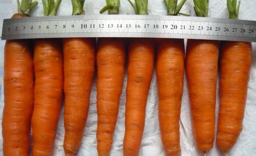 Корнеплоды средней длины (14-16 см), массой 90-160 г, имеют ярко-оранжевый цвет и ровную цилиндрическую форму с тупым, немного суженным концом.