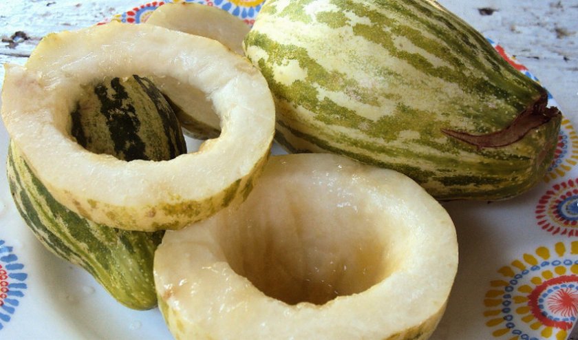 Зрелые плоды по форме напоминают дыню и вырастают до 60–80 см в длину. Масса в среднем составляет 6–8 кг. Кожица желтеет и покрывается зеленоватыми полосками. При разрезе внутри видно небольшое количество семян.