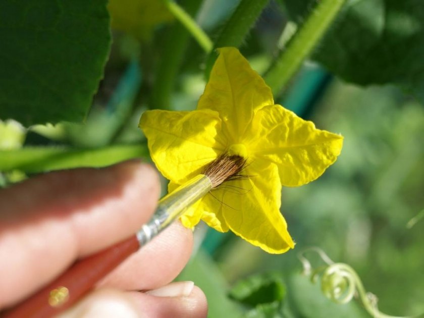Иногда применяют ручное опыление. Для этого срывают пустоцвет и аккуратно обмахивают им женские цветки, прикладывая тычинки к пестикам. При этом можно одни и те же соцветия опылять разными пустоцветами. Процедуру опыления проводят рано утром. Подробнее о ручном опылении можно посмотреть в видео.