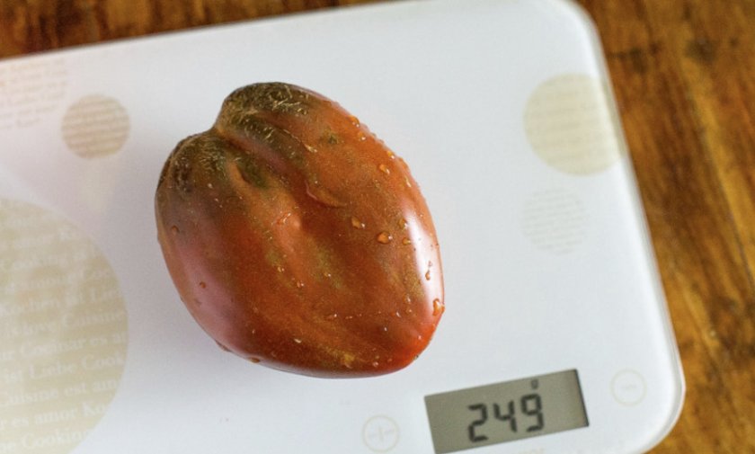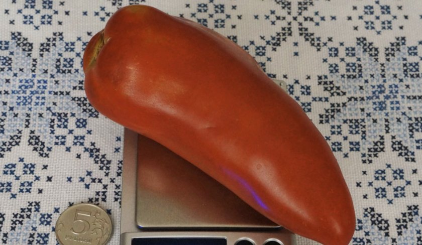 Стволы обычно прищипывают после образования 5-6 цветочной кисти. На каждой кисти может завязаться от 6 до 9 плодов. Помидоры имеют вес 150-200 г, обратнояйцевидную (перцевидную) форму и гладкую, прочную шкурку ярко красного цвета. В длину плоды достигают 15 см. Мякоть красная, плотная, с небольшим количеством семян и сока, но не сухая. Вкус гармоничный, сладкий со слабой кислинкой. Аромат – классический «помидорный».