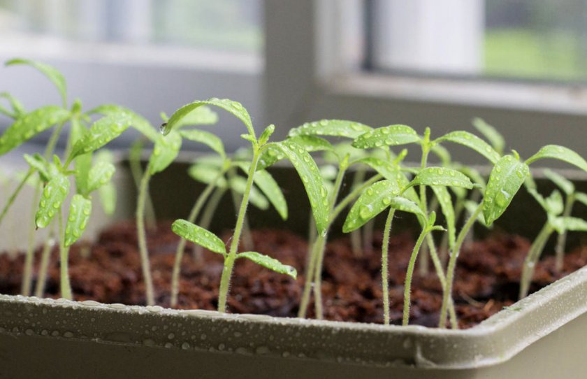 Когда проклюнутся ростки томатов, емкость раскрывают. Чтобы сеянцы не вытягивались, температуру в комнате снижают до 18 °С. Молодую рассаду регулярно поливают, подкармливают раствором золы. При появлении 2–3 листиков пикируют в отдельные горшки. За 2–3 недели до перемещения на постоянное место закаляют, вынося во двор на несколько часов.