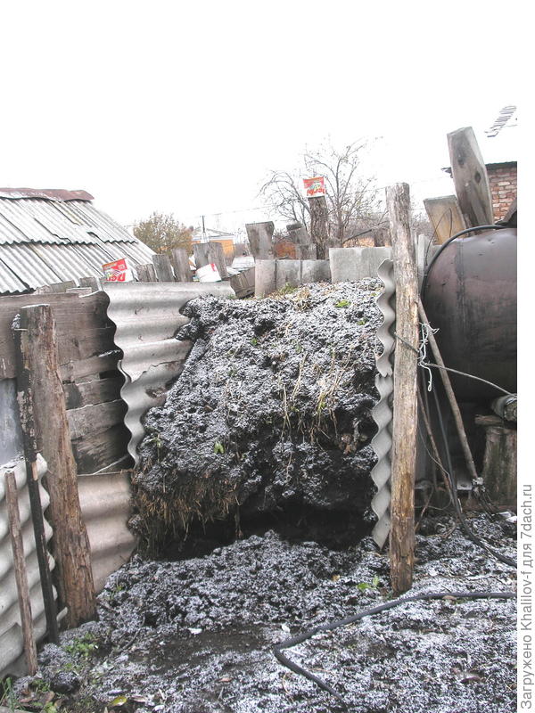 Выделенный участок заглубил на 15-20 см, дно выровнял и положил вязкую красную глину слоем 10-12 см. Глина не будет пропускать навозную жижу, которая может выделиться после сильного дождя или увлажнительных поливах кучи. На глину подстелил солому слоем 20-30 см, чтобы если будет просачиваться жидкая фаза впитывалась соломой. В четырех углах площадки, а также посередине длинной стороны поставил крепкие дубовые столбы высотой 1,5 м. и площадку с трех сторон обшил шифером. На заднюю, короткую сторону шифер прикрепил с наружной стороны столбов, а две боковые стороны – с внутренней, торцами уперев в заднюю стенку. Для задней стенки достаточно одного стандартного листа шифера длиной 170 см, а для боковых сторон использовал по два листа, пустив их около средних столбов внахлест. Один торец площадки, для удобства загрузки и использования навоза, оставил открытым. Высота навозной кучи 1,0-1,2 м