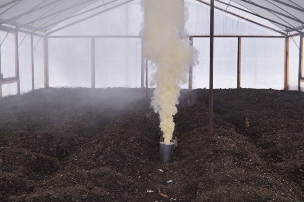 - После зажжения фитиля плотно закрыть теплицу для избегания отравления себя и окружающих культур – желательно заранее изготовить высокую трубу для отвода газов после прогорания шашки.