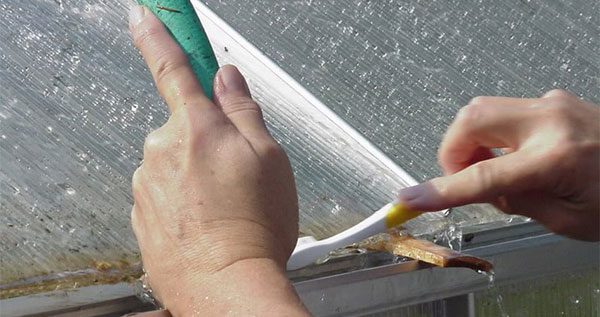Моющая процедура тепличной конструкции – обязательное условие после предварительной уборки от мусора.
