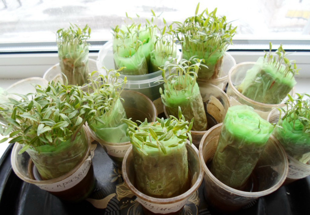 Пикировкой называют самую первую пересадку проросших ростков культур. Даже если вы использовали пелёночный метод для проращивания, можете снова пересадить ростки в пленку, немного изменив состав самой пеленки. Или пересадить в обычные емкости с почвенной смесью.